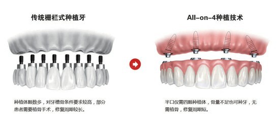 “All-on-4”全口种植牙是一种针对半口或全口牙种植的修复方案,用极少的种植体实现使用功能,仅需每个单颌种植四个种植体即可支撑半口的牙桥。植入种植体后即刻安装固定牙桥,通常无需植骨,克服了传统种植牙槽骨不足无法种植的缺陷。